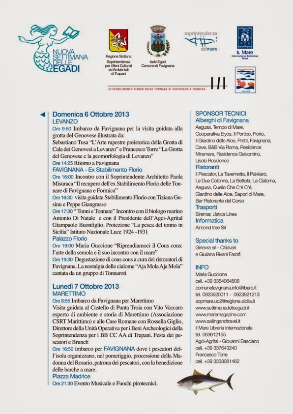 marmellate, erbe aromatiche, miele etc.; 8) mostre fotografiche internazionali; 9) proiezione e premi per i migliori cortometraggi; 10) mostre e presentazioni di libri con la presenza degli autori; 11) mostre di quadri; 12) concerti di musica classica. In tal modo si assicura l’apertura per tutto l’anno del grande edificio che avrà una vita propria. Le Egadi hanno anche una grande importanza naturalistica per la biodiversità e la ricchezza di fauna marina in acque cristalline sino a grandi profondità, tanto che vi è stata istituita la più grande Area Marina Protetta d’Europa, a tutela della prateria di Posidonia Oceanica più estesa del Mediterraneo, di oltre 70 siti di immersione e innumerevoli grotte sommerse e semisommerse, dove recentemente è tornata la Foca Monaca, specie più minacciata del Mediterraneo, estinta in italia da oltre 40 anni. Per svolgere attività di educazione ambientale sarebbe importante attivare l’acquario mediterraneo a palazzetto Florio, (già esistente e mai aperto) con un bookshop che curerà l’ideazione e la vendita di gadget, e realizzare il previsto centro recupero per tartarughe marine. Sono da valorizzare anche i geomorfositi, come le grotte marine di Favignana, Marettimo e Levanzo, con la sua Grotta del Genovese, assieme alle cave di tufo e i ritrovamenti nelle grotte di Favignana di inumati del Paleolitico superiore; le presenze fenicio-puniche nelle cave di tufo di Favignana e nelle grotte di Marettimo, le vasche romane per la lavorazione del garum a Levanzo.
