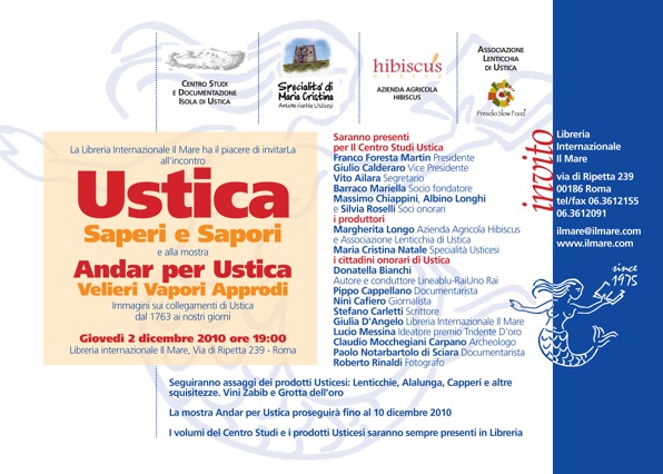 Il prossimo 2 dicembre nella nostra Libreria organizziamo una Serata Ustica, Saperi e Sapori da godersi con la mente, col cuore e col palato, dedicata sia agli appassionati dell’isola, sia a quanti desiderano fare per la prima volta la sua conoscenza, in un contesto culturale così ricco di attrazione per gli amanti del mare come quello offerto dall’ormai storica libreria di via di Ripetta, che ha da poco compiuto il suo trentacinquesimo anni di attività.