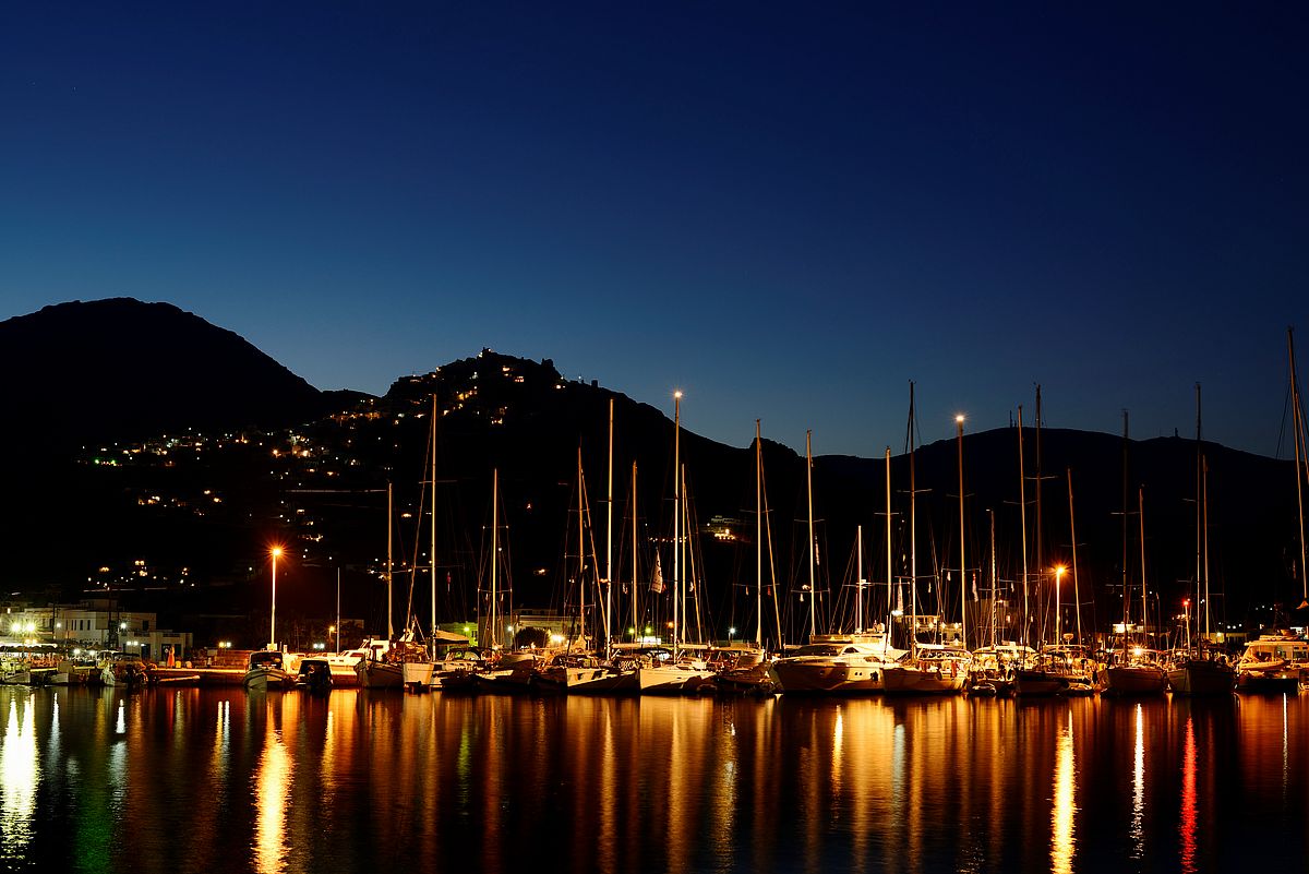 A ds. Barche ormeggiate al porto di Ios, nelle Cicladi. Lʼormeggio con corpo morto è gratuito. In banchina, moderne colonnine made in Italy per i servizi cui si accede con una card a scalare: con un paio di euro al giorno hai acqua e elettricità.Ma è quasi sempre un luogo sicuro e con questi costi ti fermi volentieri un paio di giorni. Che, per l’economia locale, vuol dire che farai la spesa, il rifornimento carburante, la cena fuori, magari affitterai un motorino o una macchina per visitare meglio il posto.
