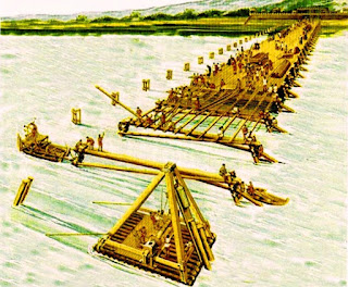 La struttura militare in legno per permettere il passaggio del fiume Reno, fu concepita da Cesare nel corso delle due campagne contro i popoli germanici, durante la conquista della Gallia. Il prof. Francesco Maria Pellegrini in un suo libro del 1898 analizzò la struttura del ponte costruito da Giulio C., così come descritta nel libro IV° del “de bello gallico”, dandone una propria interpretazione. Personalmente, avendo avuto la fortuna di aver “dovuto” studiare il latino, ho preferito leggere la descrizione della costruzione del ponte (in realtà furono due) direttamente da Giulio C. nel suo “De bello gallico”.
