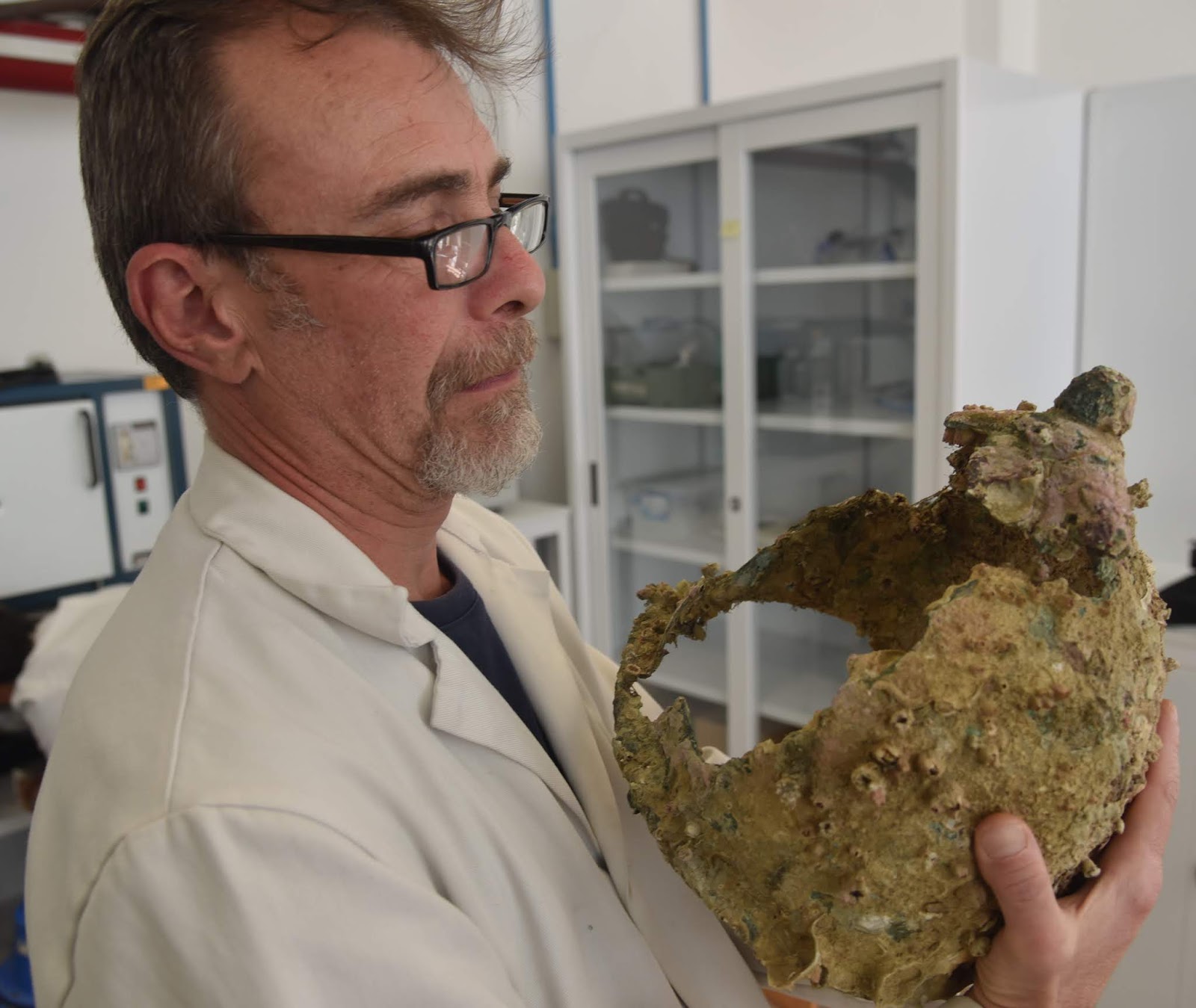 Considerato che il lavaggio richiede almeno cinque o sei mesi, i tecnici prevedono di finire tutto il lavoro entro un anno. Per quanto riguarda l’elmo, altro reperto consegnato all’ISCR, non sono ancora iniziati interventi specifici conservativi. È definito elmo di Montefortino, una tipologia estremamente rara di copricapo protettivo bronzeo. Recava sulla sua sommità un leone o una pelle di leone mentre la sua rottura, con le parti mancanti, è dovuta alla deposizione nei fondali. È diispirazione celtica, introdotto alla fine del V secolo e fu chiamato così perché rinvenuto per la prima volta in una necropoli in provincia di Ancona. La sua forma allungata garantiva maggiore resistenza ai colpi dall’alto. Nella parte più elevata è collocato un apex, sul quale siinserivano delle piume, con lo scopo di far sembrare più imponenti i soldati all’occhio del nemico.