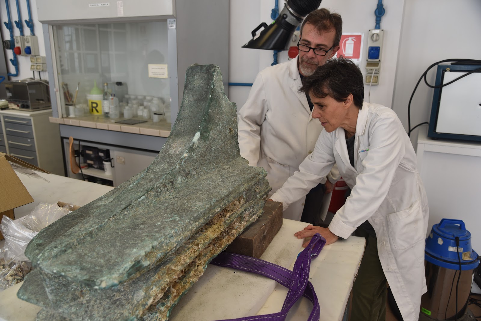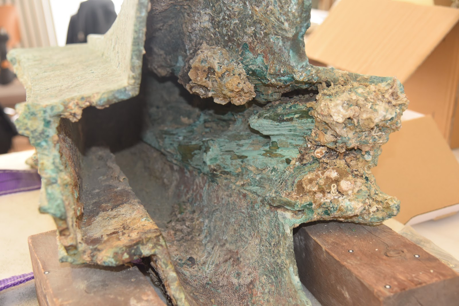 L’importante reperto, come detto, è ancora in una fase preliminare di pulitura; si sta infatti rimuovendo lo strato esterno di concrezioni prima di arrivare a una definitiva resa finale con lavaggi intensivi in acqua distillata. Il metallo immerso in acqua salmastra, infatti, nel corso dei secoli assorbe molti sali marini che interagiscono con il rame della lega producendo cloruri di rame che rappresentano una delle forme più pericolose di corrosione attiva. All’interno del rostro, sul laterale destro, si è conservata, in adesione mediante spalmo di resina di natura non nota, una porzione ampia del legno della cinta terminale della barca, anch’esso ricoperto delle stesse patine marine del bronzo. Poiché legno e metallo non possono essere restaurati assieme, i restauratori tenteranno di rimuovere questa porzione di legno e ricollocarla a fine trattamento.