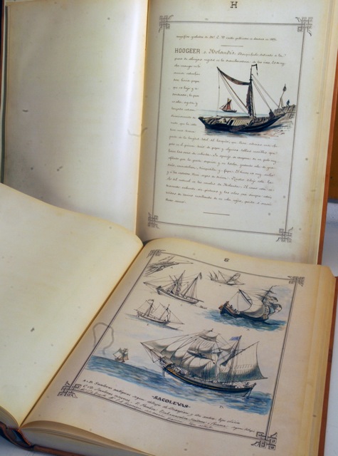 Messi uno sull’altro i tre volumi misurano un metro e mezzo e pesano quasi venti chili. Ma più che di libri si tratta di una vera e propria opera d’arte unica di questo genere. Parliamo della ristampa anastatica di un’opera del 1889 conservata nel Museo Navale di Madrid dal titolo “Construcciones navales, Bajo su aspecto artistico, con gli acquarelli del restaurador Rafael Monleon”. Un vero e proprio catalogo descrittivo ricco di dettagli delle principali imbarcazioni, dalla presistoria a fine secolo XVIII, inserite in ordine alfabetico, delle più importanti barche e navi che solcavano i mari dei cinque continenti.