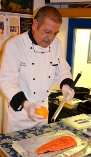 La prima lezione, come da programma è iniziata con la prova pratica di sfilettatura di una spigola e di un sauro utilizzati per preparare una tartare e un carpaccio conditi con olio extravergine, erbe aromatiche e un particolare sale affumicato, il maldon, che viene dal Galles.