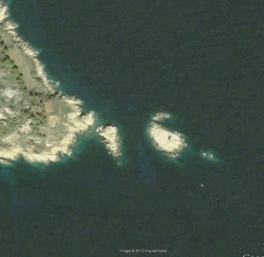 Nell’immagine Google Earth degli scogli delle Scole si vede chiaramente quello più esterno sul quale ha impattato la Concordia, pochi metri più a destra e la nave si salvava! Veramente incredibile come anche il destino abbia giocato un suo ruolo in questa scellerata consuetudine che tutti, – dall’armatore per finire ai comandanti della Capitanerie – conoscevano, e permettevano, di avvicinarsi alla costa per “