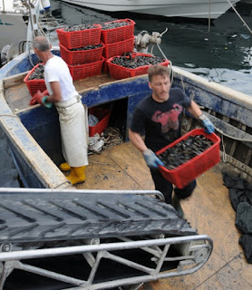 A sn. La lancia che trasporta le cassette piene di cozze dalla barca appoggio al molo si allontana alla fine della giornata. L’allegria dei napoletani è contagiosa, e non si smorza neanche dopo ore di duro lavoro. C’è molto da imparare dalla loro filosofia di vita. E' ora d'imparare ad avere rispetto del sud. Capito nord?!