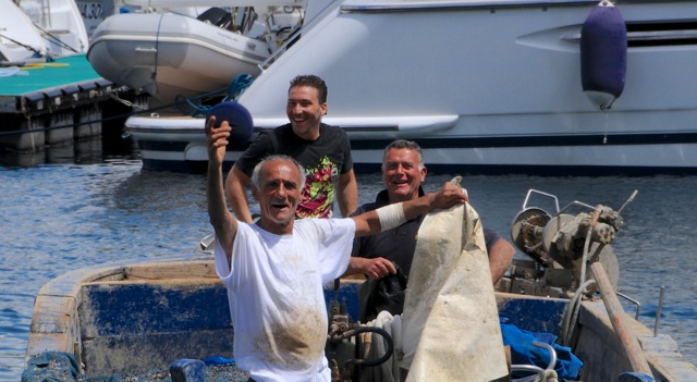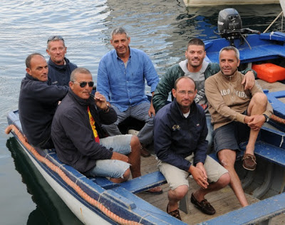 A sn. Una grande famiglia; seduti sulla dritta della lancia il trio degli ormeggiatori, Fasano, Michele, Ciro, Carlo, sulla poppa Gennaro Presutto, sulla sinistra Carlo (con il genero) e Luciano Scognamillo, il cuore della Coop Servizi Nautici S.Lucia.