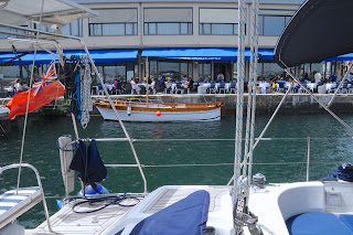 A ds. Il Borgo Marinari visto entrando, dopo essersi lasciati l’allevamento di cozze a sinistra. Al centro il ristorante Transatlantico, d’angolo, e sulla sinistra tutti i posti barca offerti dalla Coop Servizi Nautici S.Lucia.