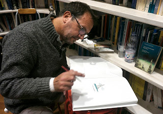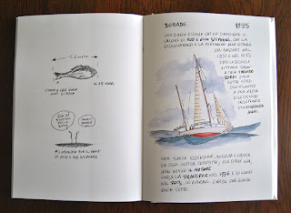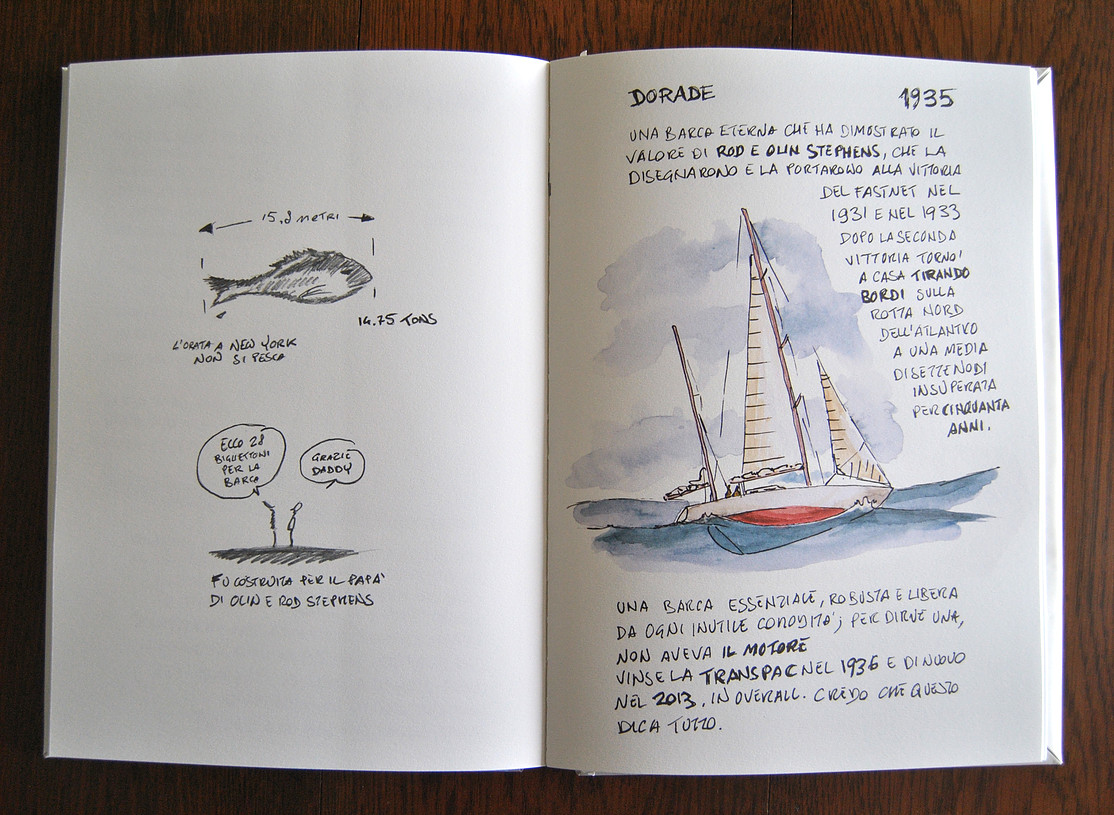 A chi ha acquistato la copia in libreria, Davide ha fatto un regalo particolarissimo: la dedica con un suo disegno! Con molta pazienza ha tirato fuori il suo “necessaire” da viaggio per disegnare, matite, chine, acquerelli, ha trovato uno spazio adatto tra gli sgabelli e una dopo l’altra ha “dedicato” tutte le copie vendute. Davide continua a disegnare nella sua Lerici, però solo se è convinto e non ama tornare sugli stessi argomenti. Per questo nelle 300 copie in commercio ha lasciato una pagina in bianco per essere personalizzata con una barca in più, da disegnare all’occasione; è dedicata a quegli armatori di belle barche o per chi vuole fare un regalo prezioso: al loro comandante, equipaggi ai loro armatori, amici ad amici. Quindi per avere il “ritratto” della tua barca dovete far avere in libreria la descrizione della vostra barca con più foto possibile, che si vedano bene i colori dello scafo e delle vele. Necessaria anche una descrizione dell’equipaggio (famiglia con bambini, amici, coppia in pensione…).