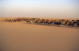 Io non avevo i 30 chili sulle spalle, ognuno di noi aveva una propria cavalcatura per salirci in qualsiasi momento se ne aveva bisogno nelle ore più calde della giornata, ma in realtà tutti salivamo sul dromedario per non più di due ore al giorno, solo quando il sole era veramente feroce, in ogni caso lassù sul dromedario dopo un po’ ti stanchi, senti le articolazioni che si bloccano, così preferisci scendere e camminare perché l’animale oscilla continuamente. È una marcia inesorabile, dalle 5 del mattino fino alle 9 alle dieci di sera, quando il capo carovana stabiliva il punto per accamparci. Nella carovana ho perso quattro chili mentre nella transumanza una decina, mangiavamo una sola volta al giorno un po’ di riso e fagioli, con un clima incredibilmente ostile, pesante.