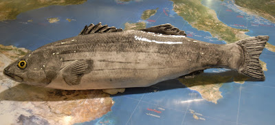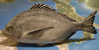 Avete però ottenuto il suo calco, chiamato anche stampo che fate seccare ben bene. Poi versate al suo interno della creta bianca liquida ed attendete qualche minuto. Riaprite le due parti di gesso e liberate la candida spigola da voi creata e “cucinatela” al forno a 970° per circa un’ora. Tiratela fuori e quando si è freddata la decorate come si deve, e qui si vedrà la vostra bravura, e la ricuocete ancora a 940° per circa 8 ore. Dopo questa cottura la rifinite con una vernice “cristallina” per ottenere un bell’effetto di lucido brillante, “et voila”, il piatto, pardon, la ceramica è servita. La ricetta è particolarmente lunga ma produce pezzi unici e realisticicome potete ammirare nelle fotografie.