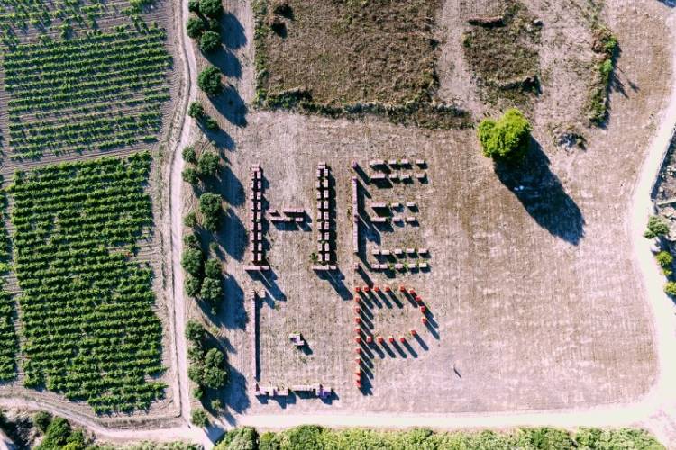 La parola HELP tracciata sul terreno nell’area archeologica dell’isola di Mozia con cinque milioni di tappi di plastica colorata racchiusi in gabbioni metallici, le grandi lettere tridimensionali alte fino a 4 metri ciascuna per una estensione totale di circa 1.500 metri quadrati. È l’imponente installazione