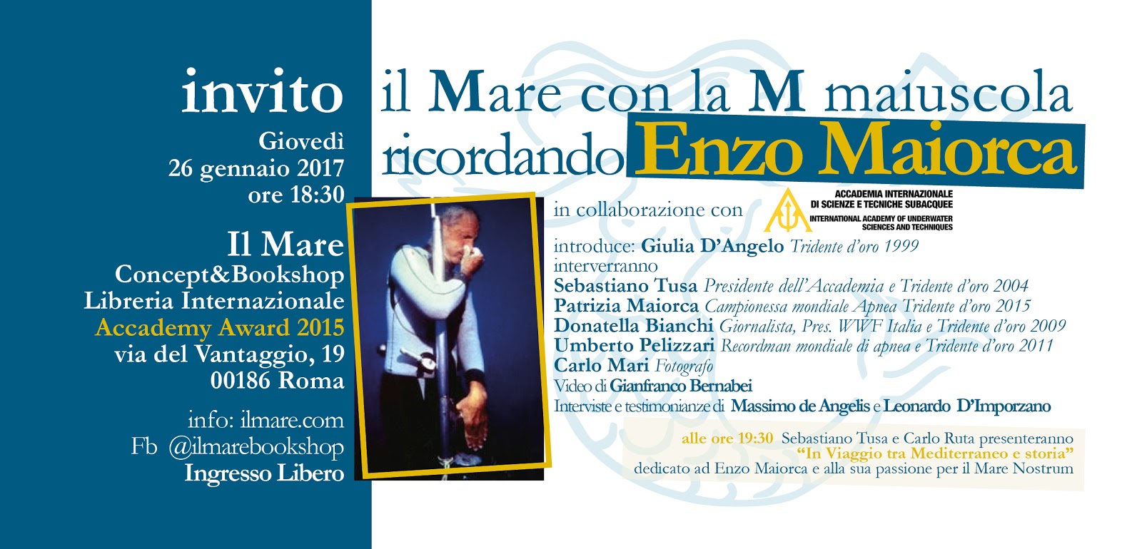 Cinque giorni al doppio appuntamento in libreria. Prendete nota, fate un bel nodo al fazzoletto, ditelo ai vostri amici e parenti. Giovedì 26 dalle 18 per ricordare e commemorare Enzo Maiorca a poco più di due mesi dalla sua scomparsa e contemporaneamente per ascoltare Sebastiano Tusa e Carlo Ruta che ci parleranno del loro saggio In viaggio tra Mediterraneo e Storia. Sarà l’Accademia Internazionale di Scienze e Tecniche Subacquee di Ustica a ricordare il grande Enzo, insignito del Tridente d’Oro nel 1964, con gli interventi della figlia Patrizia, di Donatella Bianchi, del Presidente Tusa, del campione Umberto Pelizzari, del fotografo Carlo Mari e di Giulia D’Angelo. L’Accademia riunisce tutti quelli che hanno ricevuto il Tridente d’Oro creato ad Ustica nel 1960, considerato il Nobel delle attività subacquee Maiorca lo ha ricevuto nel 1964.