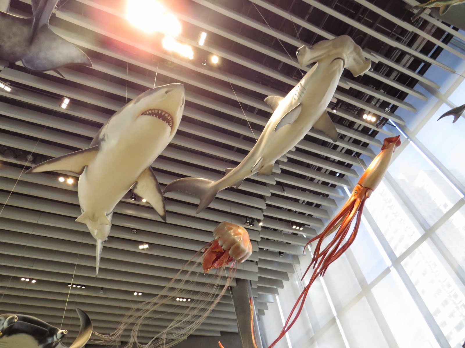 La balenottera azzurra è lunga 24 metri, lo squalo balena 15, quello bianco 6, il martello 5, il narvalo 5 più tre metri del suo dentone nella tipica forma che ha dato origine al mito dell’unicorno, il calamaro gigante raggiunge i 10 metri come la medusa con tutti i suoi tentacoli, la manta 6, il pesce vela e lo storione 2, e un pesce spatola tipico del Fiume Giallo, Huáng Hé in cinese, soltanto un metro e mezzo. E poi per non farsi mancare nulla 15 metri di un rettile marino con le pinne, un po’ avanti con l’età, si è estinto nel cretacico: il plesiosauro.