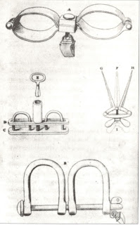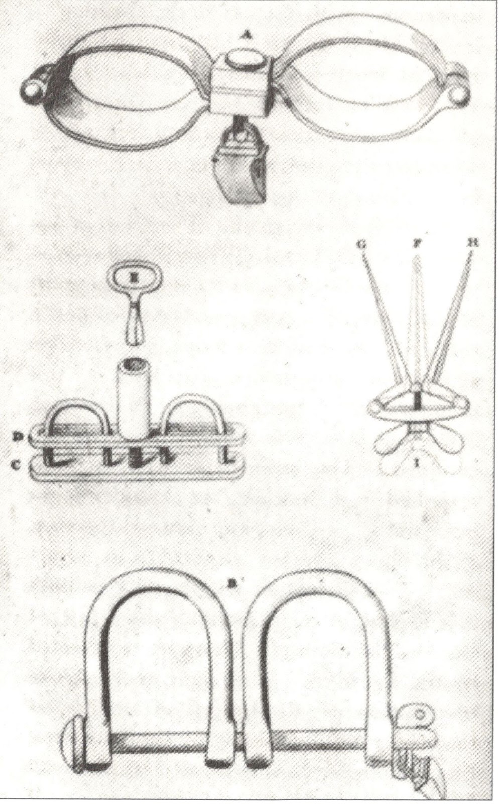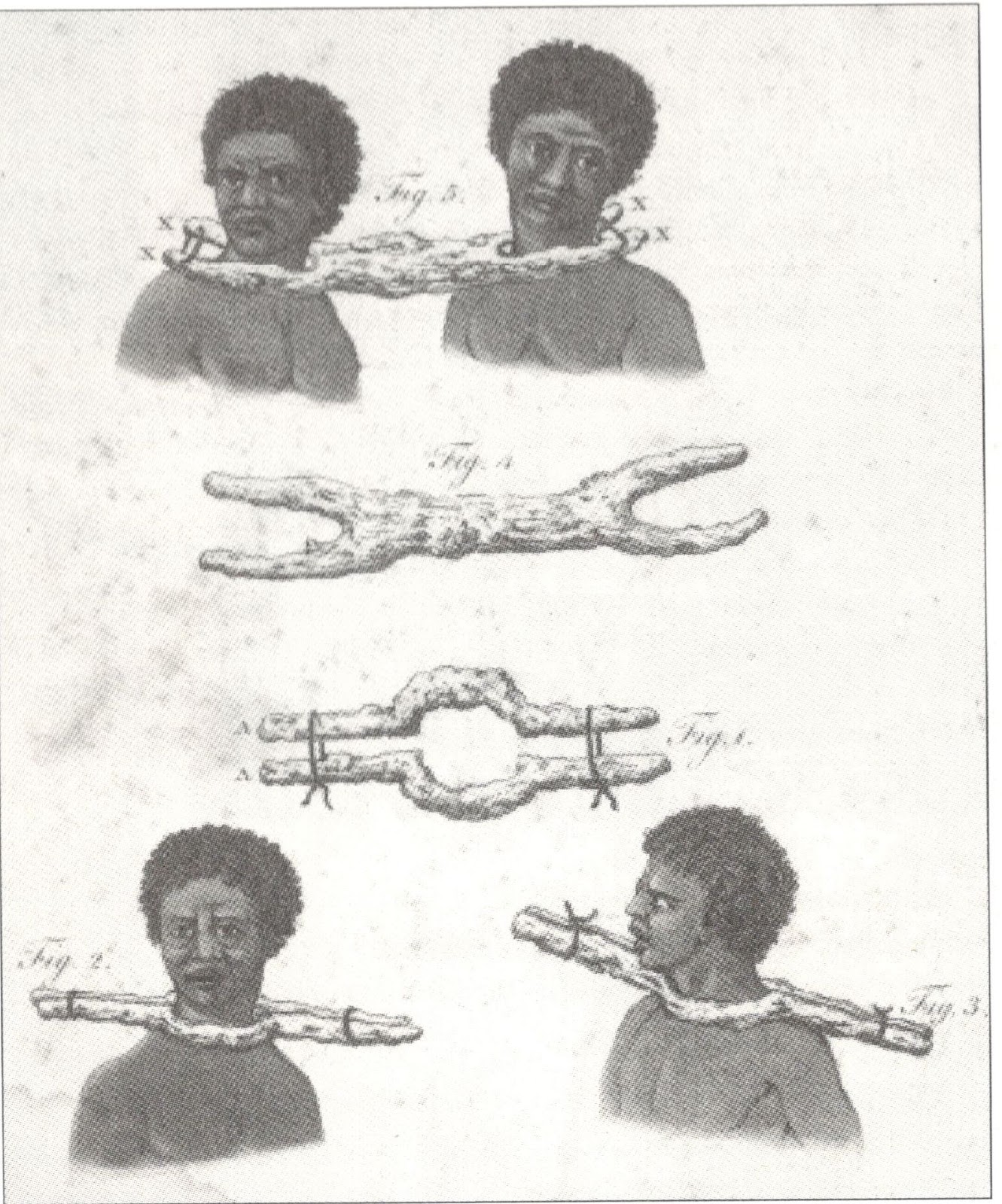 Nella foto a destra una ragazza di quindici anni frustrata a morte perché si era rifiutata di danzare nuda.Foto a sinistra: nelle lunghe marce per raggiungere l’imbarco queste costrizioni erano usate per tenere sotto controllo le carovane di schiavi. A destra: La nave negriera Brooks di Liverpool descrive la spaventosa realtà su come erano “stivati” gli schiavi. In basso: manette per i polsi e ceppi per le caviglie, lo schiacciapollici per torturare gli schiavi ribelli e lo speculum oris per tenere aperta la bocca nell’alimentazione forzata.