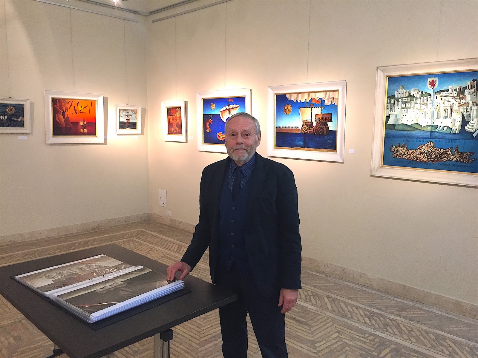 Il passo decisivo è stata la visita allo studio del maestro. Tavoli da disegno affollati di libri, Moby Dick in primo piano e il mare ovunque, di un blu potente e vivo, tutt’uno con il cielo. Città che in realtà sono navi e pesci e venti e pennelli ovunque, ordinatissimi, come le cime per un marinaio.