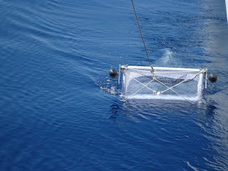 A destra nella foto CNR Un momento del campionamento in mare aperto, con le maglie pronte a raccogliere le particelle di plastica.