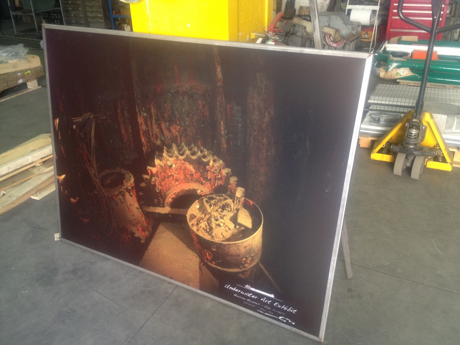 Per compensare la galleggiabilità del forex ci siamo inventati un telaio in acciaio inox che contiene le stampe appoggiate al relitto con un cavo metallico senza fare nulla per intaccare il relitto e senza lasciare tracce una volta che la mostra verrà rimossa. Tutte cose che abbiamo scoperto un po’ alla volta.