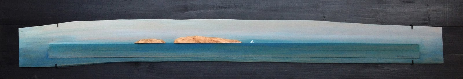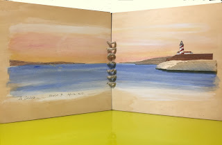 Paolo Bernacca con i primi 5 delle sue pagine salate che ideò proprio il 4 aprile del 2012 per fare un regalo a Giulia. Due pagine di compensato nel formato trenta per trenta centimetri unite con lo spago per rappresentare un classico delle sue illustrazioni: un faro piazzato su un promontorio fatto di pezzi di legno di scarto recuperati nel laboratorio del suo amico falegname che si trova poco distante da casa.