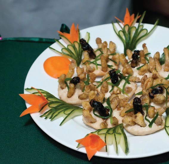 Tra le sue specialità ha inserito larve, scorpioni, grilli saltati in padella e formiche fritte. Gli scorpioni saltati in padella e serviti su crostini con gamberetti, specialità di Singapore, rappresentano una vera e propria sfida culinaria di grande successo. I grilli fritti sostituiscono alla grande le patatine, paragonabili nel gusto addirittura ai gamberetti. La cucina con gli insetti è sicuramente una dieta ricca di proteine.