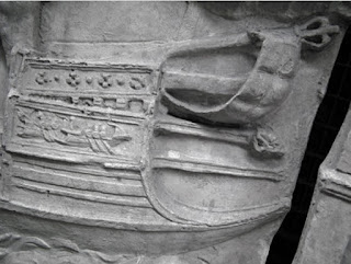 L’aspetto della prua denota alcune caratteristiche singolari che ne fanno, tipologicamente, un unicum tra le navi raffigurate sulla Colonna: tre lunghe travi a sezione quadra, con una scanalatura longitudinale e una con testa di ariete, sporgono a prua nello lo spazio normalmente riservato al proembolion (uno sperone della nave, prominente sopra il rostro e conformato spesso a protome animale, che aveva la funzione di limitare la penetrazione del rostro nella fiancata della nave nemica). Queste caratteristiche ci autorizzano a definire questa nave un particolare tipo di Liburna che poteva essere stata realizzata appositamente per il trasporto o l’utilizzo in battaglia di “macchine belliche” come le balliste? Una supposizione forse confortata dal fatto che i citati elementi si protendono minacciosi proprio dai Propugnacula di prua (sorta di castello di combattimento) decorati da due lastre, forse metalliche, recanti rosette e due imbarcazioni a rilievo, una delle quali con prua simile a quella ricostruita. Forse tali lastre avevano anche una funzione protettiva contro il lancio di proiettili nemici (dardi, pietre, ecc..).
