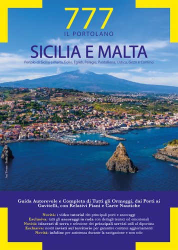 777 Sicilia e Malta è l’unica guida per diportisti che contiene, accanto a tutte le informazioni necessarie per la navigazione, anche utili informazioni a corredo su attività e servizi d’appoggio a terra. La nuova edizione, che racchiude in un unico volume la Sicilia e i suoi Arcipelaghi (Eolie, Egadi, Pelagie, Ustica e Pantelleria) e le vicine isole di Malta e Gozo, oltre ad avere una grafica più chiara, è stata arricchita di nuovi contenuti, come la griglia delle coordinate, le informazioni su riserve ed aree marine protette, i servizi offerti da porti e marina, itinerari di terra, attività commerciali e di ristorazione. Ulteriore caratteristica esclusiva è l’indicazione di un numero di telefono unico al quale far riferimento per tutte le informazioni necessarie e per effettuare la prenotazione dell’ormeggio. La guida ora comprende circa 115 carte e 311 piani nautici, frutto di un intero anno di lavoro in loco, per eseguire rilievi e raccogliere dati, e lavoro di redazione, con disegno cartografico e impaginazione. Nella sezione meteo sono inserite le pilot charts stagionali, la mappa delle correnti e tutte le statistiche decennali delle stazioni meteo siciliane. Novità: I Video Tutorial dei principali porti e ancoraggi. Esclusiva: Tutti gli Ancoraggi in rada con dettagli tecnici ed emozionali. Novità: Itinerari di terra e selezione dei principali servizi utili al diportista. Esclusiva: Nostri Inviati sul territorio per garantire continui aggiornamenti. Novità: Infoline per assistenza durante la navigazione e non solo.