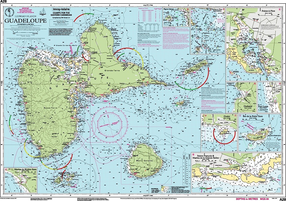 in plastica scala 1: 150.000. Plans included: Deshaies scale 1:25.000; Pigeon Island scale 1:25.000; Marina de Rivière Sens scale 1:10.000; Pointe-à-Pitre Approaches scale 1:50.000; Pointe-à-Pitre scale 1:25.000; Gosier scale 1:30.000; Sainte François & Marina de la Grande Saline scale 1:10.000; Port Louis scale 1:20.000; Îles de la Petite Terre scale 1:50.000.