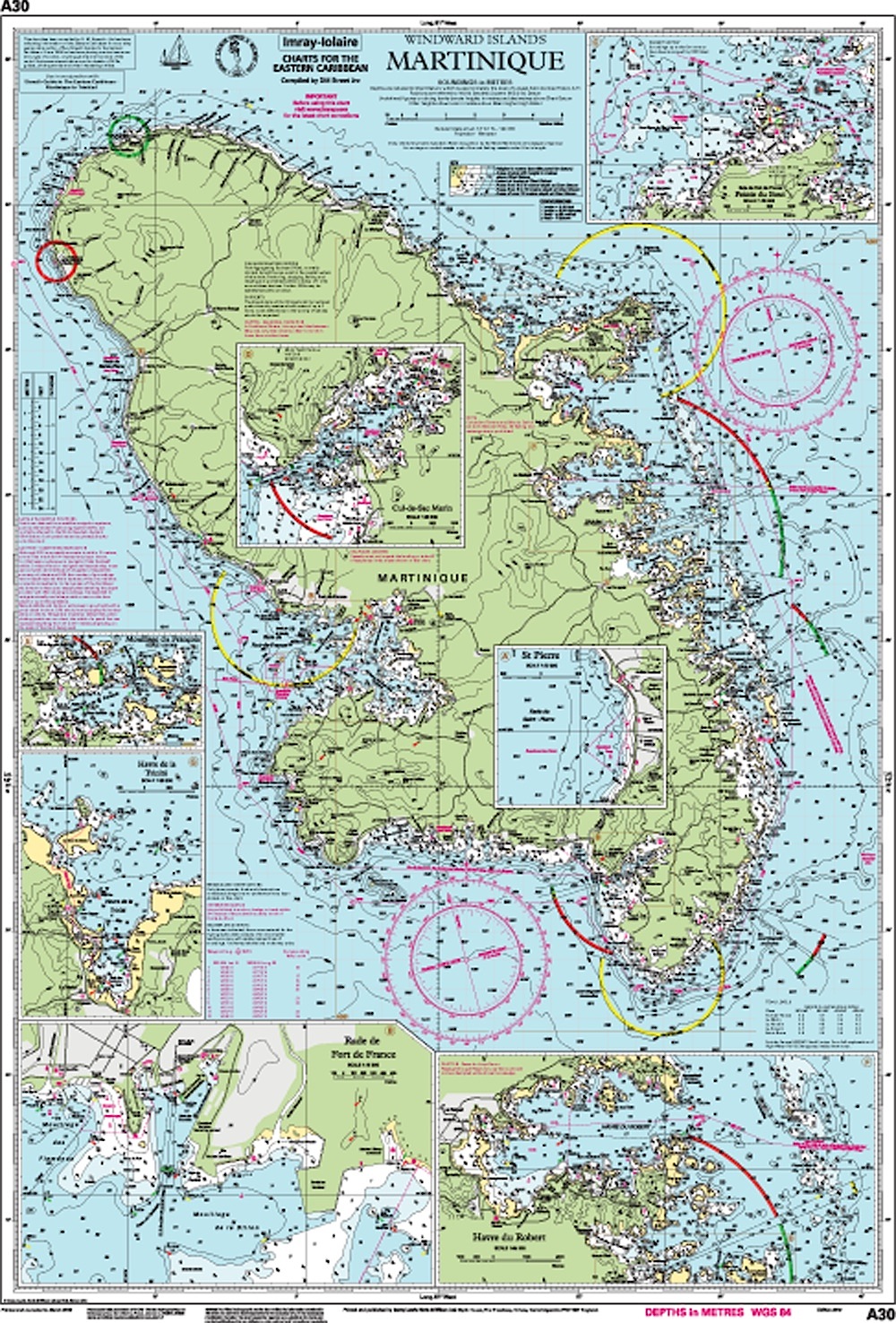 in plastica scala 1:95.000. Plans included: St Pierre scale 1:20.000; Rade de Fort de France scale 1:15.000; Pointe du Bout scale 1:35.000; Cul-de-Sac Marin scale 1:35.000; Mouillage du François scale 1:50.000; Havre du Robert scale 1:45.000; Havre de la Trinité scale 1:30.000.