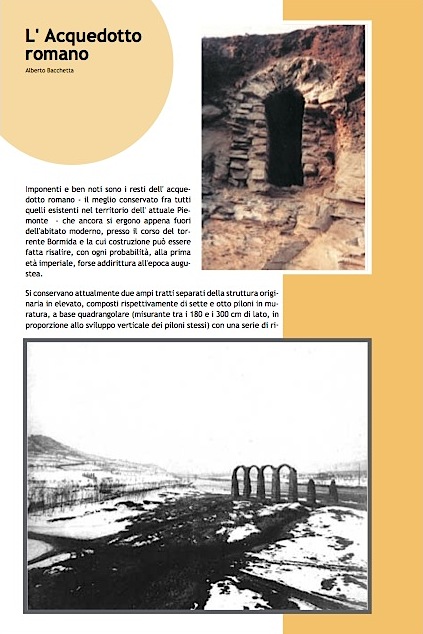 La seconda delle guide dedicate ai percorsi archeologici urbani di Acqui Terme è dedicata ad uno dei monumenti che da sempre sono simbolo della città: i resti imponenti dell'acquedotto romano. Come ben illustra il contenuto di questo testo, tali resti archeologici, posti lungo il percorso del fiume Bormida, evocano il senso della romanizzazione del Piemonte insieme alle Porte Palatine di Torino e all'Arco augusteo di Susa