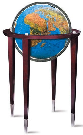 40cm illuminated, blue ocean physical/political globe in a handsome dark cherry floor stand with nickel accents, with mountains in raised-relief.