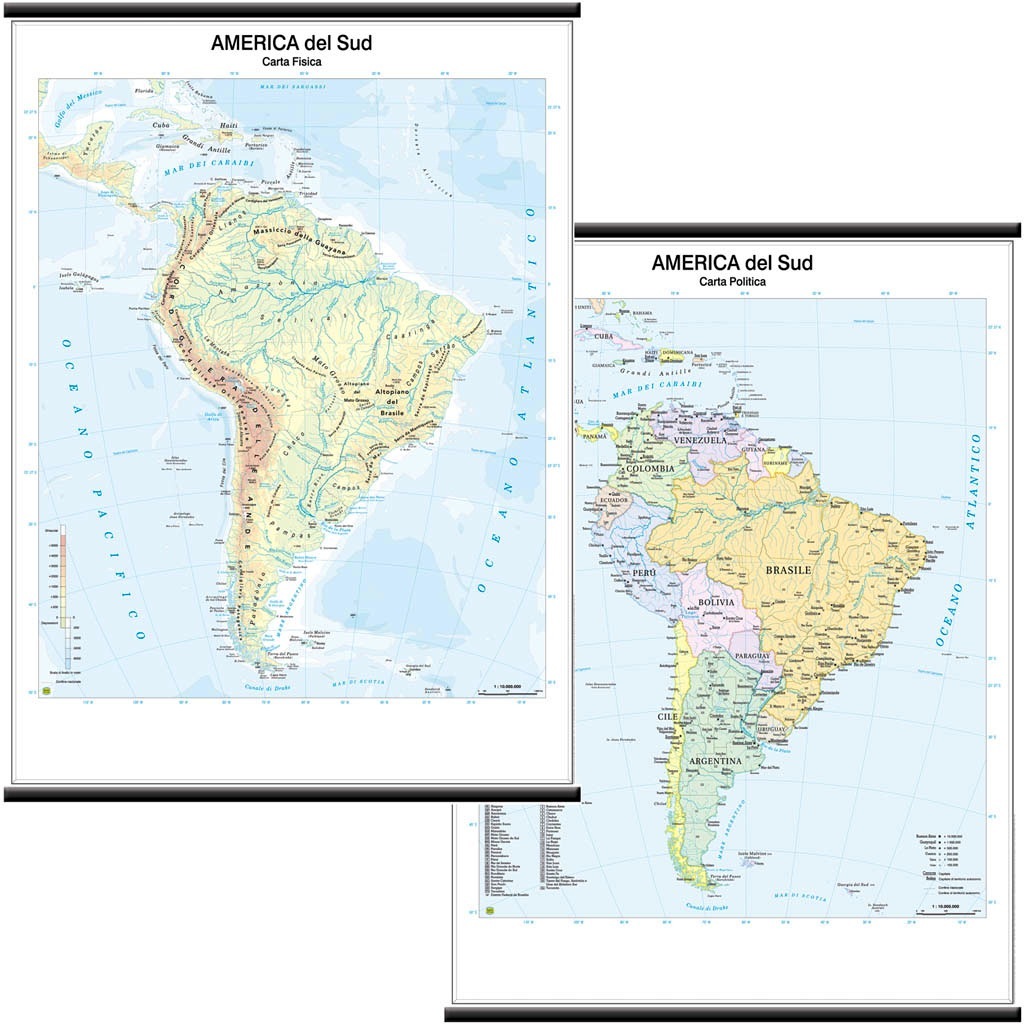 Carta murale scolastica di grande formato fisico-politica stampata su entrambi i lati. La carta politica rappresenta con chiarezza la suddivisione amministrativa utilizzando diversi colori per l'individuazione degli stati e grandi caratteri ben leggibili per i toponimi. Sono indicati i nomi degli stati, delle regioni, delle capitali e delle principali città con una chiara indicazione del numero di abitanti (suddivisione a fasce). La carta fisica rappresenta tutta l'idrografia e l'orografia con l'utilizzo di tinte per le quote altimetriche e gradazioni di azzurro per le batimetrie. Sono indicati i nomi dei monti, delle catene montuose, delle regioni fisiche, delle valli, pianure, altopiani e depressioni. Plastificatura opaca antiriflesso (ottima leggibilità in ogni condizione di luce). Montata con aste di sostegno in plastica e confezionata in tubo di cartone o plastica per la spedizione.