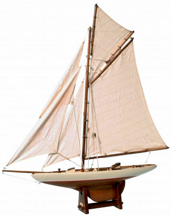 Precision-modelled in the style of the great America's Cup racers of the 1890s - Valkyrie, Columbia, Shamrock I, Reliance - these display yachts are nothing short of magnificent. They have hollow hulls constructed entirely of wood whilst on deck there are delightful details such as adjustable rigging blocks, sewn cotton sails, raised gunwales and even brass protector bars on the deckhouses. In the right setting they transform a room.