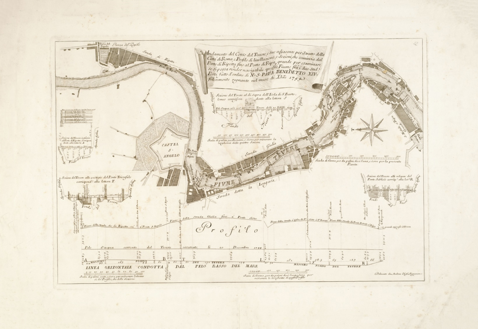 Per esaminare se si possa render navigabile questo fiume fra i due Sud. I porti fatto d’ordine del N.S.Papa Benedetto XIV felicemente regnante nel mese di novembre 1744. Foglio unico inciso su rame, delineato da Andrea Chiesa Ingegnere. Scala grafica in canne romane. scala 1:5.400 cm.68x41