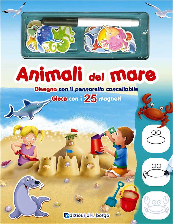 Seguendo le semplici istruzioni presenti in ogni pagina il bambino potrà divertirsi a disegnare gli animali del mare con il pennarello ad inchiostro cancellabile. Poi, con uno straccetto, potrà pulire la pagina e disegnarli nuovamente, per tutte le volte che vuole! Inoltre, con i 25 magneti forniti con il libro, potrà giocare a completare le scene delle 4 pagine magnetiche presenti al centro del volume, per un divertimento senza fine! A partire dai 3 anni.