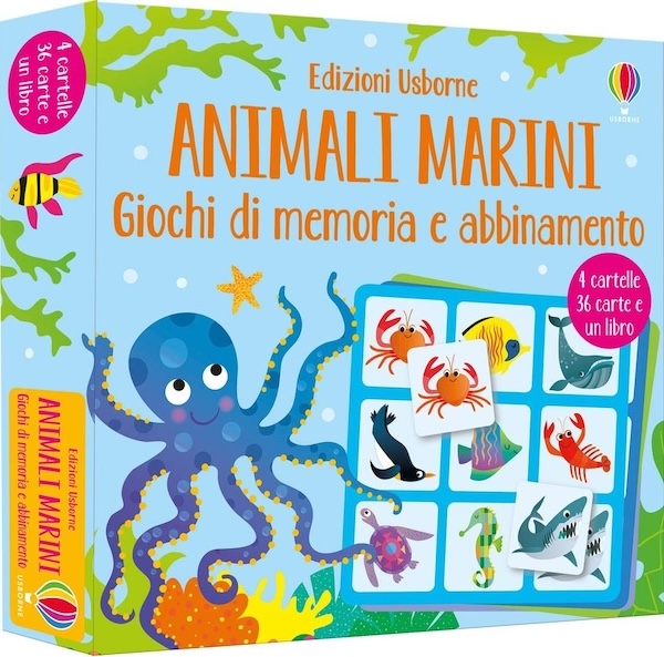 Un cofanetto con 36 carte illustrate sul tema degli animali marini, 4 cartelle e un libro illustrato con tante informazioni sulle creature raffigurate, nonché le istruzioni per due divertenti giochi di memoria e abbinamento. Da 2 a 5 giocatori. Età di lettura: da 4 anni.