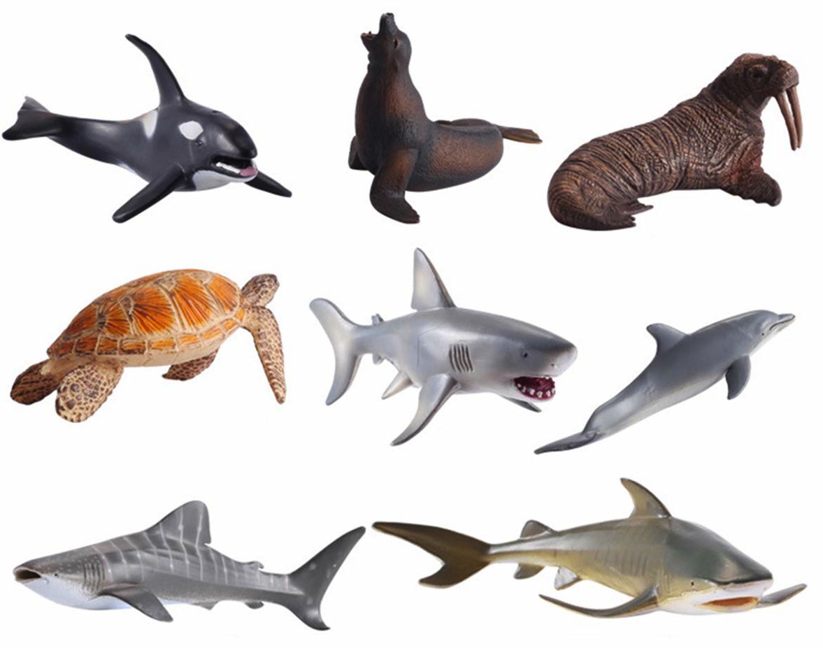 orca, delfino, tricheco, foca, tartaruga, squalo bianco, squalo balena, squalo tigre