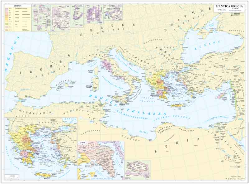 Rappresenta il bacino del Mediterraneo nel 500 a.C., con l’estensione della colonizzazione greca, etrusca e fenicia. Lo stanziamento ellenico è suddiviso nelle sue componenti etniche interne. La grandezza e lo stile dei caratteri distinguono le città per importanza e per la lingua (greco, etrusco e fenicio) alla quale fanno riferimento. Gli ingrandimenti della Penisola Ellenica e dell’Attica mostrano in dettaglio la situazione interna greca e sei riquadri contengono le piante di Olimpia, Delfi, Micene, Cnosso, Corinto e dell’Acròpoli di Atene.