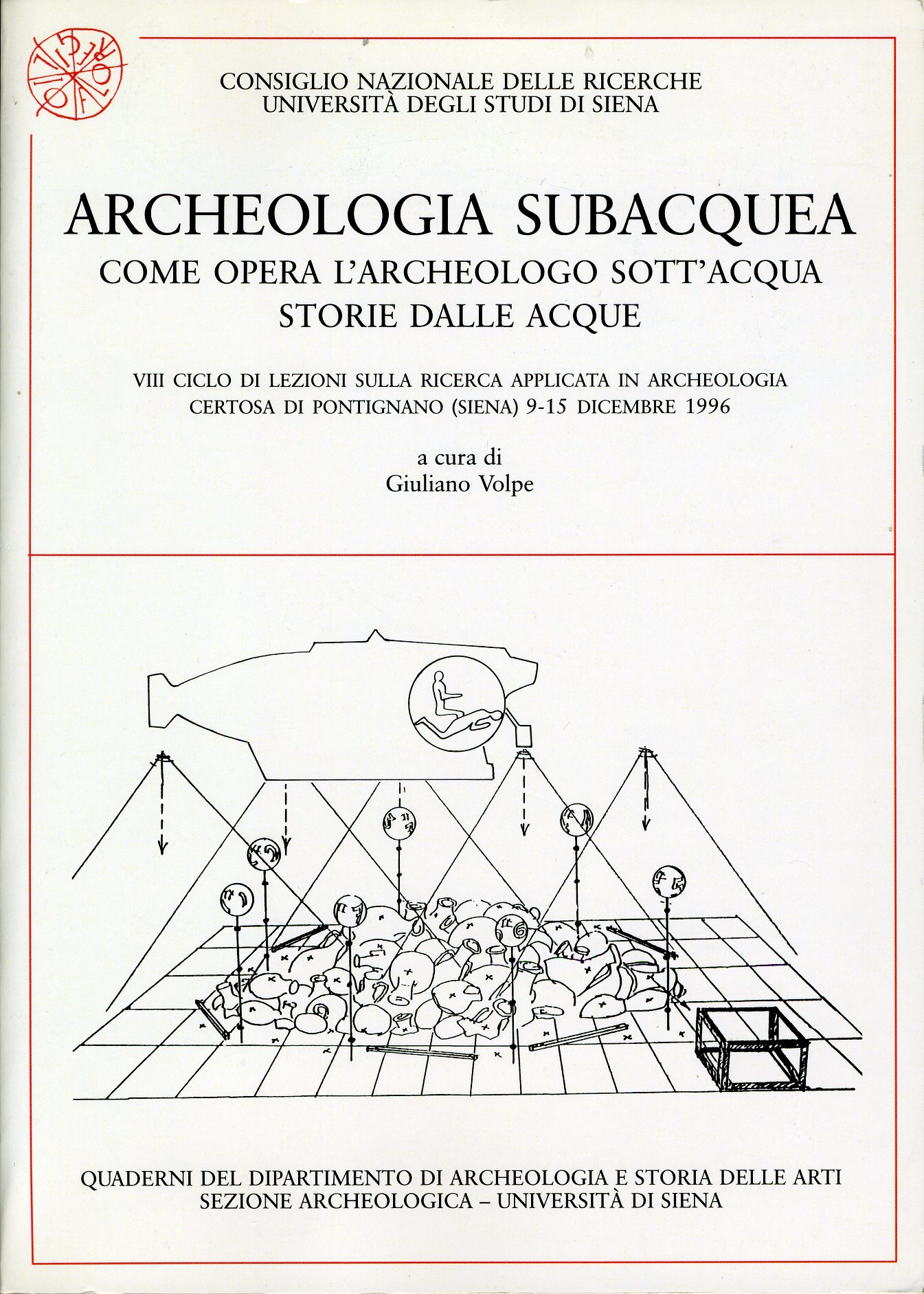 Il volume riporta gli interventi del VIII Ciclo di Lezioni organizzato dall’Università di Siena sulla Ricerca applicata in Archeologia. I testi riescono a riassumere la complessità dell’archeologia subacquea, l’ampiezza e l’articolazione di temi e di problemi affrontati, la variabilità degli ambienti e dei contesti in cui la ricerca si svolge, di fatto unificati solo dall’unico comune denominatore costituito dall’acqua. Quindi non solo archeologia sottomarina, ma archeologia subacquea tout-court, dei fiumi, dei laghi, degli insediamenti sommersi, dei porti, archeologia e architettura navale, ecc.; il tutto con un ampio spettro cronologico, dalla preistoria all’età moderna. Le sezioni in cui è articolato il volume consentono di approfondire da un lato la situazione sui fondamenti e sullo stato della disciplina, l’approfondimento del suo statuto teorico e l’analisi delle procedure, delle metodologie e delle tecniche impiegate, dall’altro l’analisi dell’uso storico dei dati acquisiti nel corso delle ricerche archeologiche, e infine gli aspetti legislativi e tecnico-burocratici.