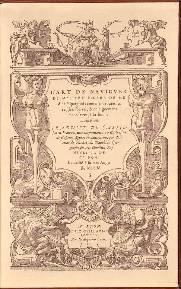 Questo pregiatissimo libro, la cui prima edizione risale al 1554, è un caposaldo della letteratura marinaresca di tutti i tempi, sia perché probabilmente è il primo testo sulla navigazione di tutti i tempi, sia per le illustrazioni di innegabile valore. "L'arte di navigare del maestro spagnolo Piero de Medina, contiene tutte le regole, i segreti e gli insegnamenti necessari alla buona navigazione. Tradotto dal castigliano al francese, con l'aggiunta di numerose illustrazioni, figure e annotazioni a cura di Nicolas de Nicolai, del Delfinato, geografo del cristianissimo re Enrico II, alla cui augustissima maestà, è dedicato il suo lavoro". Questa edizione in fac-simile di Pedro de Medina è stata ricavata da una copia, conservata nella biblioteca della città di Antwerp in Belgio, della prima edizione francese edita a Lione nel 1554 da Guillaume Rouille. L'opera, originariamente edita nel 1545 a Valladolid in Spagna, fu tradotta dal castigliano in francese da Nicolas de Nicolai.