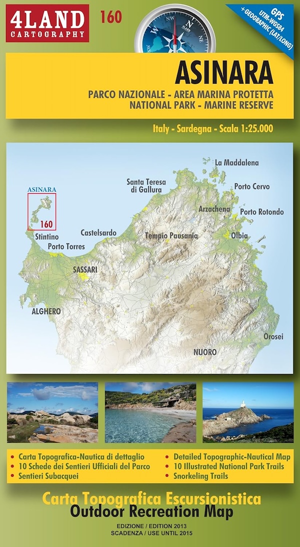 Dettagliata, accurata, carta topografica 1:25000 del Parco Nazionale - Area Marina protetta dell’Asinara in Sardegna. Questa carta è ideale per l’escursionismo, rappresenta tutti i sentieri anche i minori. Tutti i sentieri e i punti di interesse sono stati rilevati sul posto con GPS. Carta realizzata in collaborazione con il Parco.Dettagliata, accurata, carta topografica 1:25000 del Parco Nazionale - Area Marina protetta dell’Asinara in Sardegna. Questa carta è ideale per l’escursionismo, rappresenta tutti i sentieri anche i minori. Tutti i sentieri e i punti di interesse sono stati rilevati sul posto con GPS. Carta realizzata in collaborazione con il Parco. - Detailed, accurate, topographic 1:25 000 map of the National Park-Marine Reserve of Asinara Island, Sardinia. These map is ideal for the walker and biker, showing the smallest footpaths. They are the same used by Alpine Rescue. Ideal for exploring Sardinia in detail. All trails, roads and point of interest were gathered in the field using GPS devices. This version includes the Official Illustrated Guide to explore the island by foot or mountainbike. Scale 1:25.000.