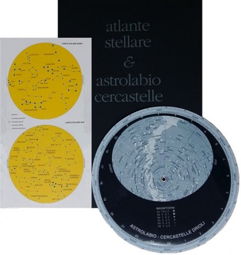 L’Atlante stellare, formato aperto cm.76x24, rappresenta il cielo notturno con due carte polari e una carta che si avvolge sulla sfera celeste lungo l’equatore. Sono presenti gli oggetti celesti fino alla quarta magnitudine, cioè quelli più agevolmente osservabili ad occhio nudo in buone condizioni di visibilità. Accanto all’atlante vero e proprio vengono date quattro diverse carte che mostrano le costellazioni osservabili nelle stagioni dell’emisfero nord terrestre. Sulle 4 carte, realizzate con stelle scure su fondo chiaro per facilitare la consultazione nelle ore notturne, sono segnalati alcuni degli oggetti non stellari più significativi. Corredano atlante e carte una legenda esplicativa, un glossario e un elenco nel quale le stelle principali compaiono oltre che con la lettera dell’alfabeto greco, che le associa alla costellazione di appartenenza, anche con il loro nome tradizionale, a Tauri = Aldebaran. Nell’elenco viene anche data la relativa magnitudine. L’Atlante è accompagnato da immagini, con l’indicazione di magnitudine, coordinate celesti e distanza, di oggetti non stellari ripresi dal telescopio spaziale Hubble o da alcuni fra i più conosciuti osservatori terrestri. L’Astrolabio-cercastelle, diametro cm.21, è realizzato in materiale plastico; dotato di un’accurata mappa celeste che permette, notte dopo notte e ora dopo ora, di seguire il moto delle stelle sulla volta celeste. Uno strumento utilissimo anche per avvicinarsi in modo semplice ai concetti di base della meccanica celeste.