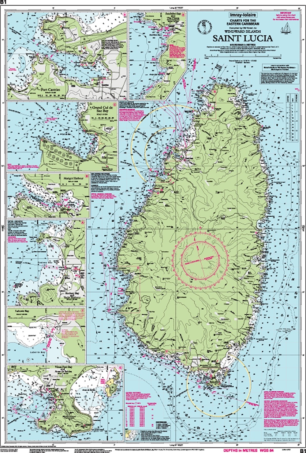 in plastica scala 1:75.000 Plans included: Rodney Bay and Yacht Harbour scale 1:25.000; Port Castries scale 1:12.500; Grand Cul de Sac Bay scale 1:15.000; Marigot Harbour scale 1:7.500; Soufrière Bay and The Pitons scale 1:40.000; Laborie Bay scale 1:20.000; Vieux Fort Bay and Anse de Sables scale 1:20.000.
