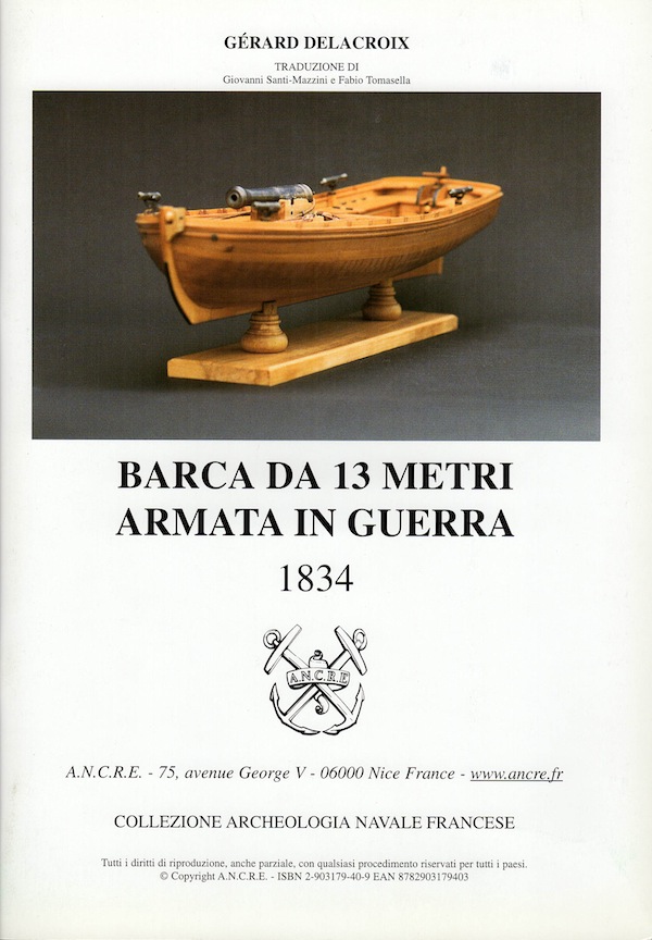 Al di là del ruolo che coprono sui vascelli, le scialuppe possono essere adattate a compiti più guerreschi. Vengono quindi impiegate per la protezione dell’entrata del porto o rade e all’appoggio nella fase di sbarco delle truppe in terre nemiche. La lancia viene, in questo caso, definita “armata da guerra”. Per questa occasione, subisce una modifica provvisoria che consiste nell’installare sui suoi banchi un cannone da caccia, cioè montato sulla prua della lancia. Questo cannone è guidato da slitte imbullonate sui banchi. Non si tratta di una lancia cannoniera, che è un tipo di bastimento ben definito, più grande e spesso con ponti, ma di una lancia tradizionale di vascello armata con un cannone di grosso calibro. La lancia trattata misura 13,00 m. di lunghezza, 3,49 m. di larghezza fuori fasciame e 1,40 m.di profondità. Le tavole commentate sono state generate da un piano dell’Atlante del Genio Marittimo datato 1834. Gérard Delacroix, modellista di talento, espone, in 40 pagine e 52 fotografie a colori, il suo metodo di costruzione per i modellisti debuttanti, che dispongono di una modesta attrezzatura. Cartella con risvolto, formato 24x31 contenete un fascicolo di 40 pagine con 52 fotografie in quadricromia, commentate e che descrivono tutte le tappe della costruzione in carpenteria della lancia e del suo cannone, il possesso di un tornio non è necessario. Sei tavole formato 30x40 che dettagliano tutti gli elementi per la costruzione.