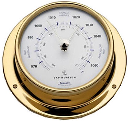Barometro di bordo professionale Cap Horizon realizzato in ottone lucidato con quadrante Ø 85 mm Dimensioni: esterno Ø 110 x 32 h.