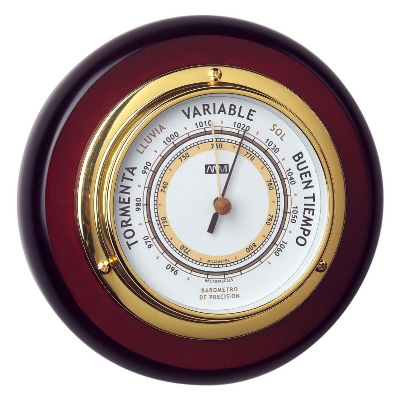 Elegante Barometro in lamierino d'ottone lucido e laccato su base in legno di ciliegio, con quadrante a sfondo bianco e grafica molto accattivante e scritte in lingua inglese. Questo raffinato oggetto è adatto ad essere appeso sia in casa, che in barca, tramite l'apposito incavo posto sul retro della base. Il barometro è fornito con istruzioni d'uso multilingue.