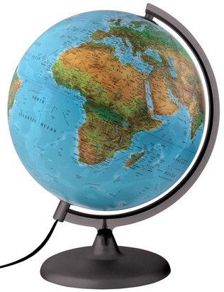Mappamondo con luce. Assemblaggio "Fai-da-te", inclusa la sfera che viene fornita divisa in due emisferi. Struttura ad alta resistenza in plastica. Cartografia aggiornata. Doppio effetto: a luce spenta la cartografia è fisica, a luce accesa appare un colore diverso per ciascun paese con un effetto generale fisico-politico.