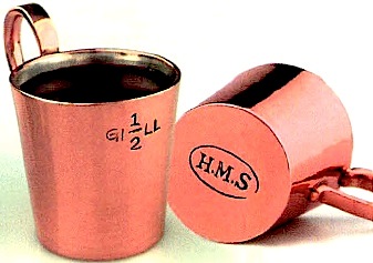 The Royal Naval rum was measured in half-gill tots and variously diluted, often into a two-gill (half-pint) measure. Our measures are made in the time-honoured way - from skilfully hand-beaten brass, copper-plated, polished, then lined with silver to neutralise taste. The bases are stamped with the prestigous HMS logo. One supplied. Height 2".