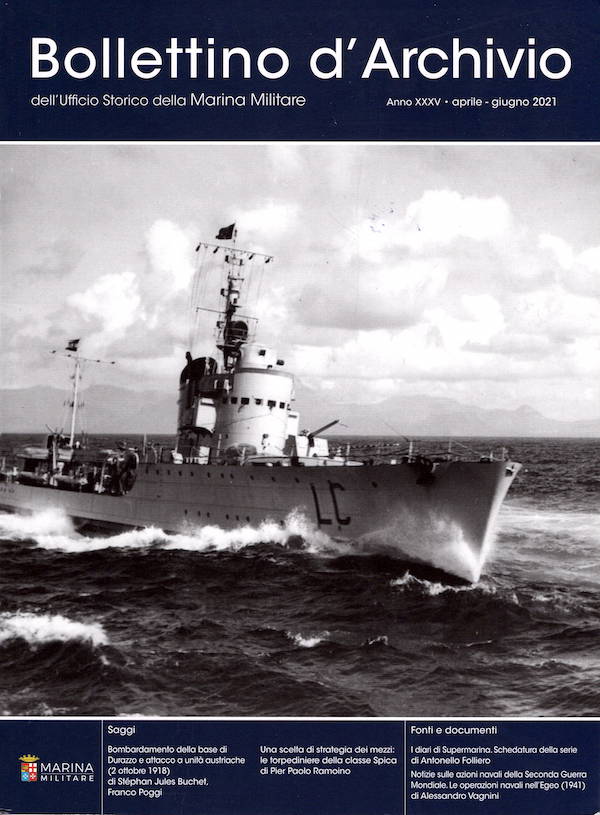 Indice: Presentazione; Saggi; Bombardamento della base di Durazzo e attacco a unità austriache (2 ottobre 1918) Stéphan Jules Buchet, Franco Poggi; Una scelta di strategia dei mezzi: le torpediniere della classe “Spica" Pier Paolo Ramoino; Fonti e documenti. Notizie sulle azioni navali della Seconda Guerra Mondiale Le operazioni navali nell’Egeo (1941) Alessandro Vagnini; I diari di Supermarina. Schedatura della serie Antonello Folliero; Autori.