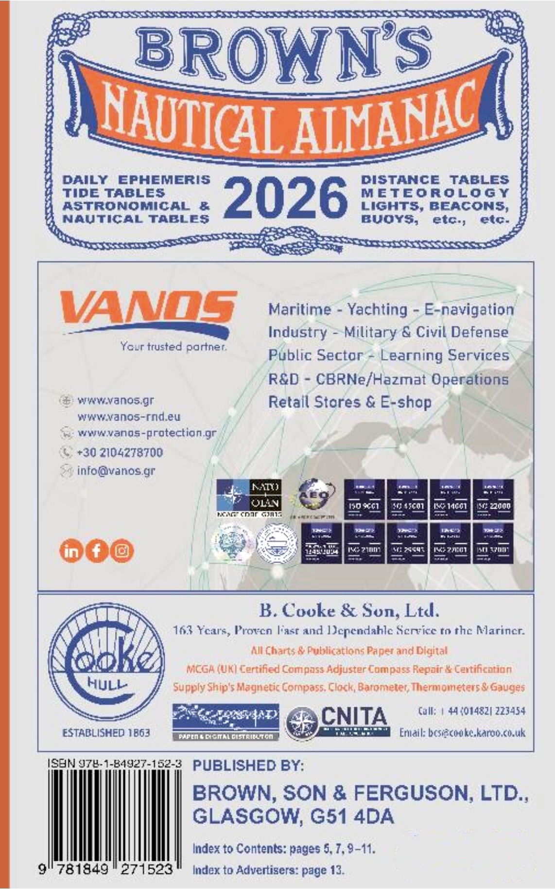 Brown, Son & Ferguson Ltd. is proud to announce that the 2026 publication of Brown’s Nautical Almanac will the 149th Edition. The Almanac will be available at home and abroad from November 2024. Established in 1850 on the south side of the River Clyde in Glasgow, Brown, Son & Ferguson Ltd. soon started publishing books for the sailing ships that visited the city. In these early days, few publications on maritime affairs were available, and its range of titles steadily grew. A new and exciting era dawned for the firm with the first issue of Brown’s Nautical Almanac in 1876. Every year it continues to be completely revised with ongoing care and attention given to its preparation. Sailors will find a wealth of detailed information, including; Buoyancy, Distance Tables, Marine Safety, Navigation, Stability, Tide Tables for World Ports and Time Zones. This list is by no means exhaustive, and sailors will find a host of useful information throughout the book.
