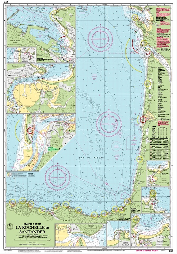 in plastica scala 1:350.000 Plans included: Approach to Arcachon 1:50 000; Capbreton 1:20 000; Rada de Higuer 1:25 000; Getaria 1:15 000; Zumaia 1:15 000; Abra de Bilbao 1:25 000; Laredo 1:20 000; Santoña 1:20 000; Santander 1:25 000; La Gironde & La Garonne 1:200 000; Continuation to Bordeaux 1:200 000.